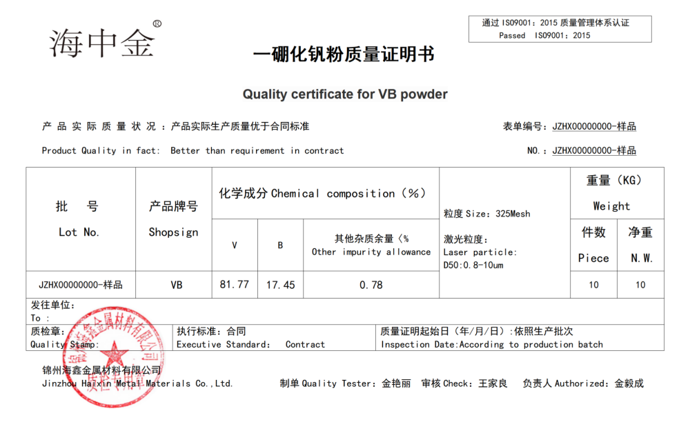 產(chǎn)品性能:VB具有熔點(diǎn)高、硬度大、導(dǎo)電導(dǎo)熱性能好、可抵抗熔融金屬侵蝕等特點(diǎn)。