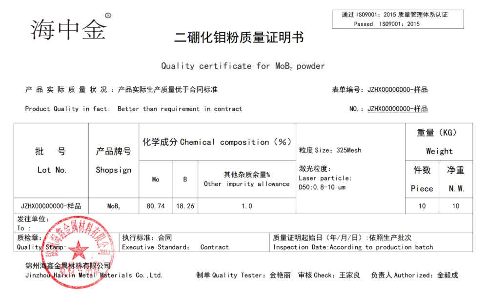 4.硼化鉬粉末被認為是一種耐磨和耐腐蝕的材料,也是鐵和鎳硼化物復(fù)合金屬陶瓷材料的重要成分。